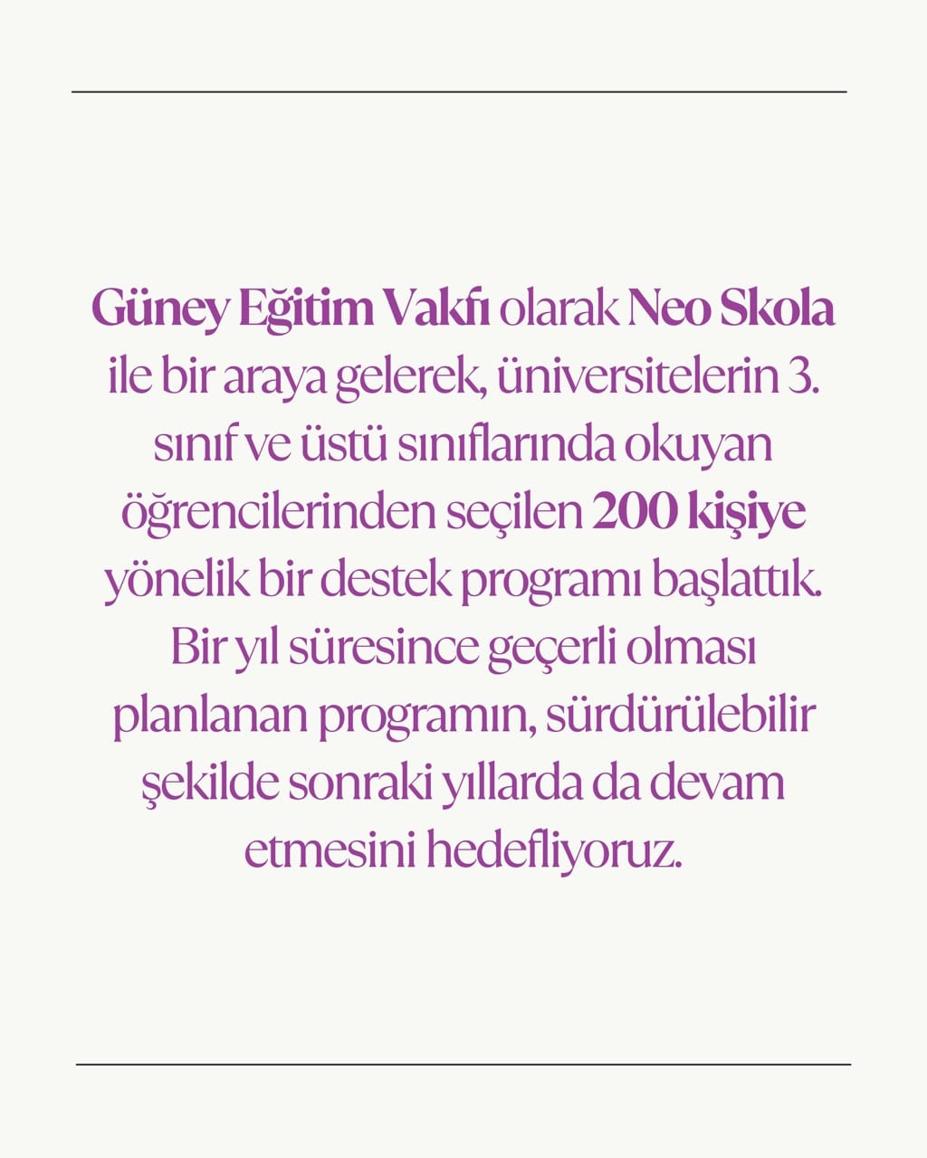 Güney Eğitim Vakfı olarak Neo Skola iş birliğiyle; üniversitelerin üç ve üstü sınıflarında okuyan öğrencilerden seçilen 200 kişiye yönelik bir destek programı başlattık. Bir yıl süresince geçerli olması planlanan programın, sürdürülebilir şekilde sonraki yıllarda da devam etmesini hedefliyoruz. Program kapsamında yapılacak değerlendirmelerde tek kriter akademik başarı değil. Öğrencilerin hayata karşı duydukları merak, farkındalıkları, kendilerini tanıma yolculukları ve potansiyelleri de seçim esnasında dikkate alınıyor. Duygu’nun “İnsan yalnızca ortaya koyduklarıyla değil; kendine sorduğu sorular ve hayata temas etme biçimiyle var oluyor. Buzdağının sadece görünen kısmını değil, altında kalanları da fark edebilmek için öğreniyorum.” sözleri programın temel duruşunu oluşturuyor.