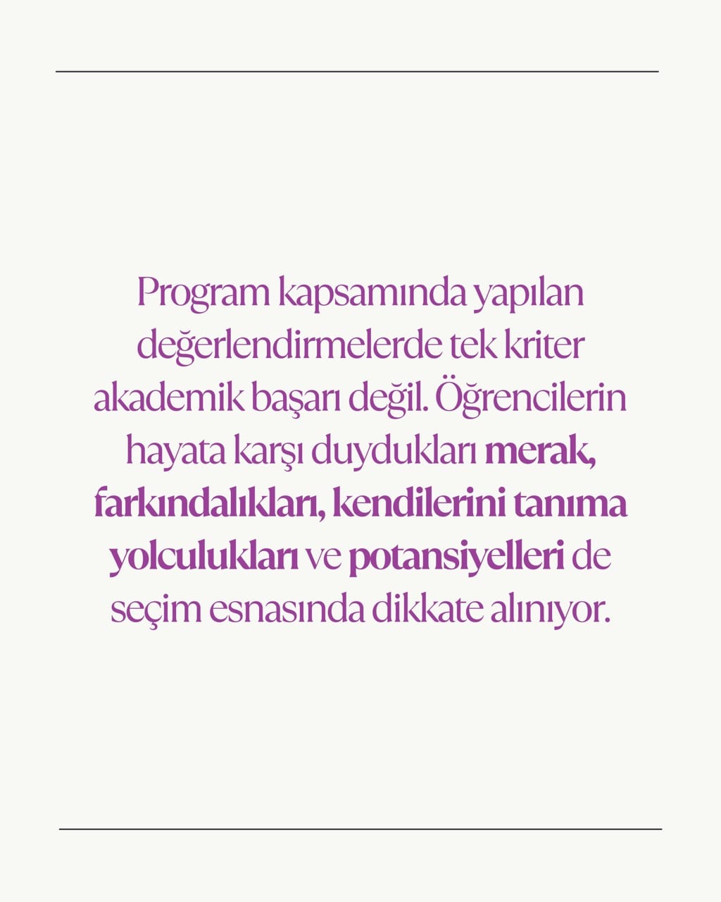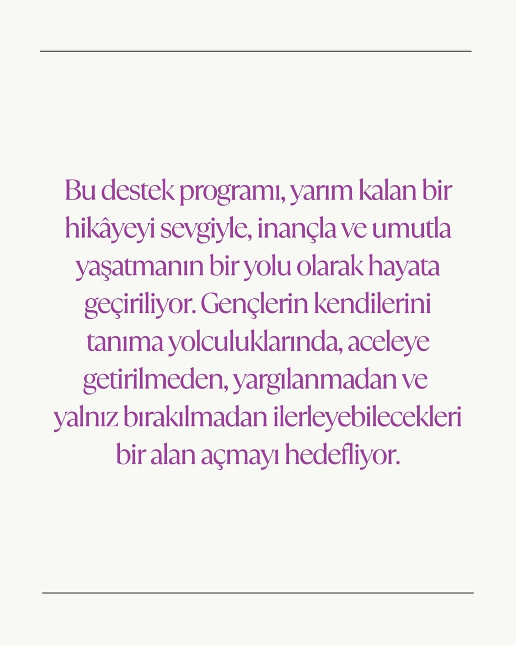 Bu destek programı, yarım kalan bir hikâyeyi sevgiyle, inançla ve umutla yaşatmanın bir yolu olarak hayata geçiriliyor. Gençlerin kendilerini tanıma yolculuklarında, aceleye getirilmeden, yargılanmadan ve yalnız bırakılmadan ilerleyebilecekleri bir alan açmayı hedefliyor.